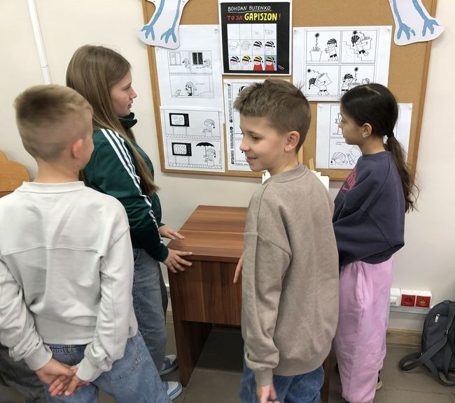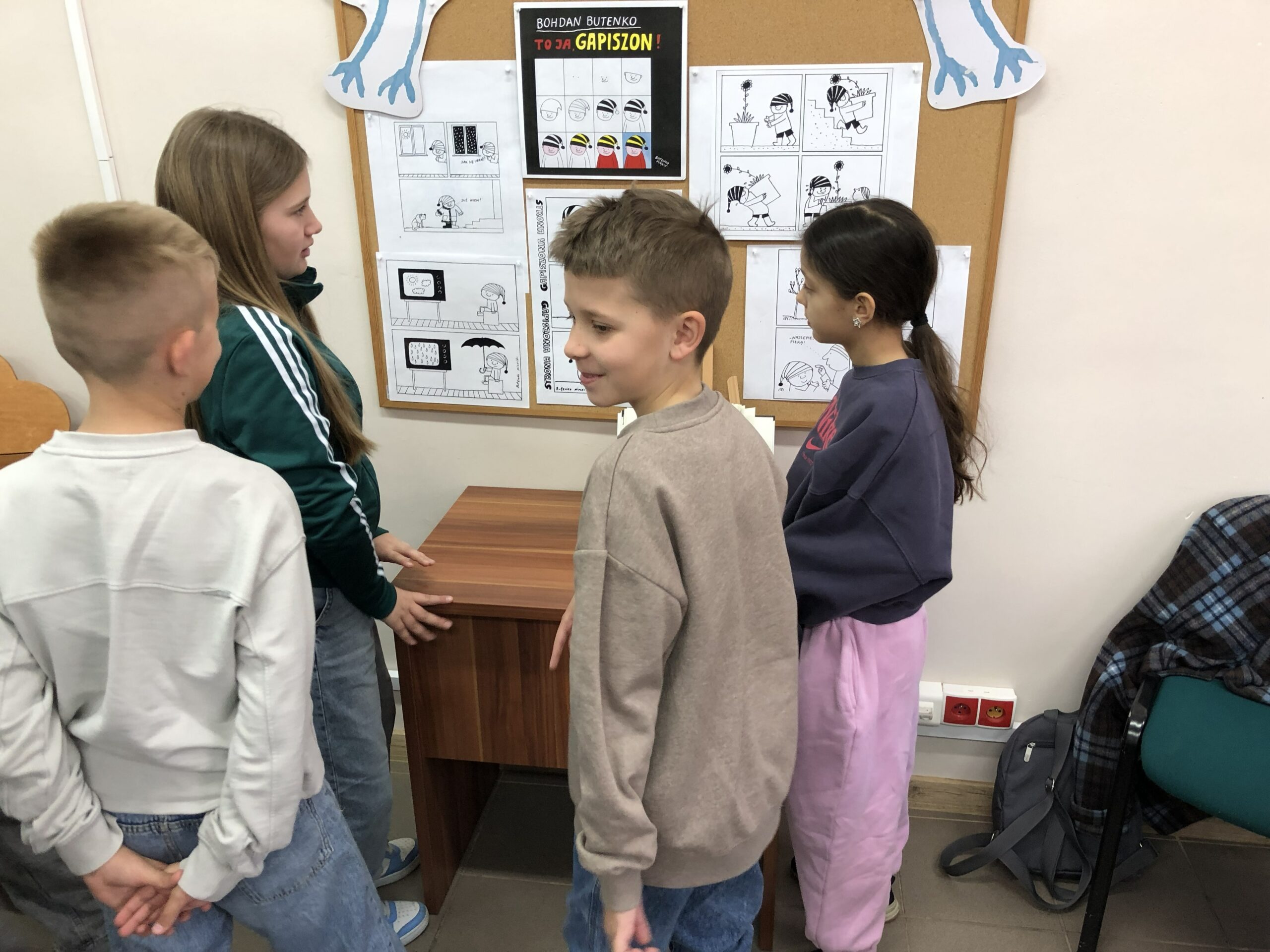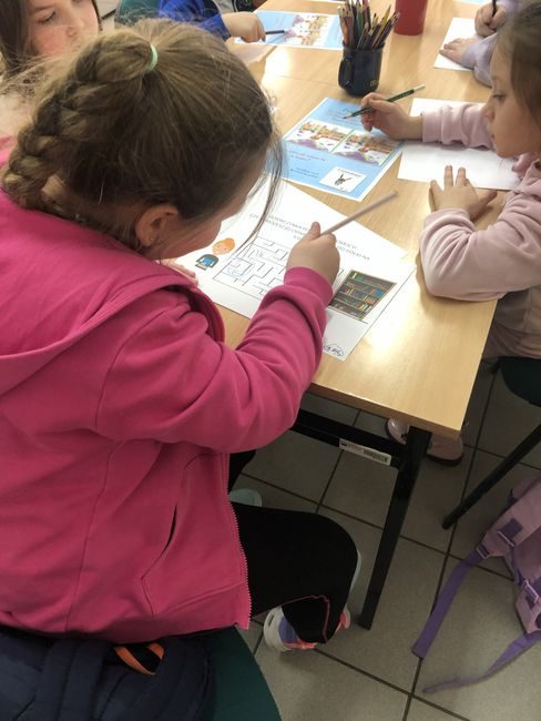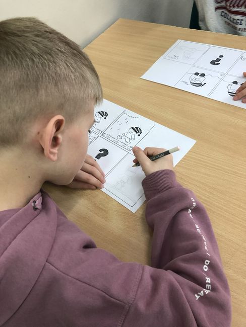 Uczniowie podczas wizyt w bibliotece uczestniczyli także w warsztatach podczas których wypełniali karty pracy utrwalając swoją wiedzę o bibliotece i książce oraz tworzyli komiks, uzupełniając kadry rysunkami.