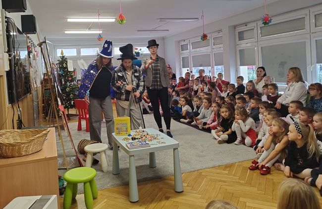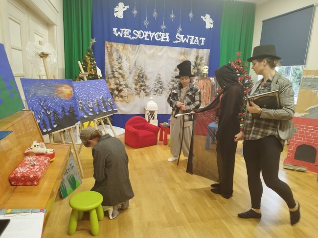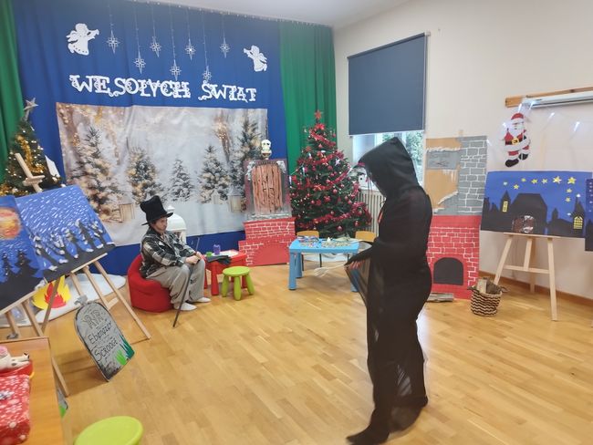 Wieczór wigilijny tuż, tuż…, wszyscy się odwiedzają i radują. Tak też było w dniu 17 grudnia 2025r., kiedy pracownicy naszej biblioteki wspólnie z młodzieżą i wychowawcami z Placówki Opiekuńczo Wychowawczej w Korfantowie odwiedzili Przedszkole nr 1 i nr 8 w Nysie. W czasie spotkania grupa młodzieży zaprezentowała dzieciom przedstawienie na motywach utworu K. Dicensa pt. ”Opowieść wigilijna”. Spektakl wprowadził przedszkolaki w niezwykły klimat Świąt Bożego Narodzenia, ucząc empatii, dobra i wdzięczności. Ważny przekaz przedstawienia dla uczestników spotkań to: „pamiętajmy, aby dźwięk monet nigdy, nie zagłuszył głosu serca”.