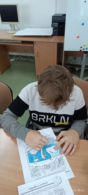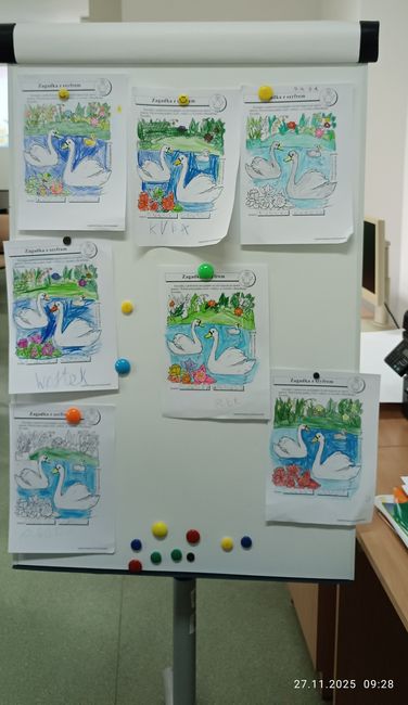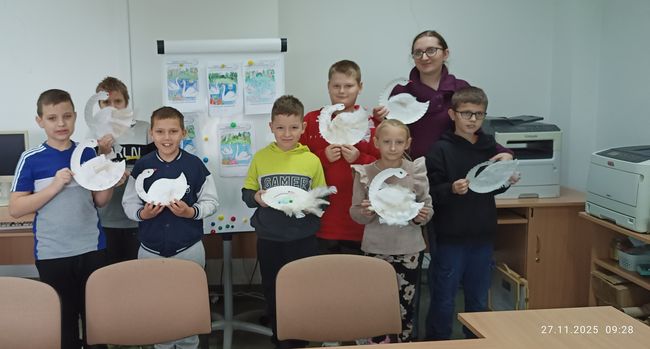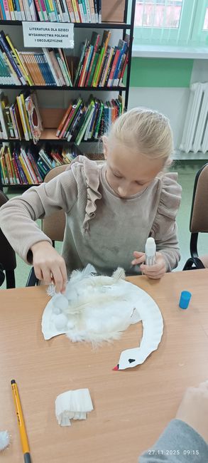 W trakcie spotkania uczniowie wykonywali karty pracy związane z tematem lekcji bibliotecznej, a następnie stworzyli piękne łabędzie na wzór bohatera czytanej baśni.