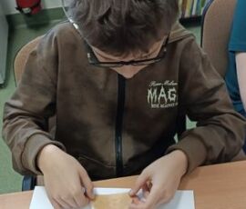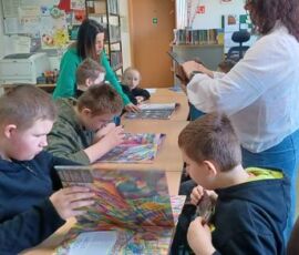 5 marca 2026 r. w Filii PBW w Kluczborku uczniowie ze Specjalnego Ośrodka Szkolno-Wychowawczego w Kluczborku wzięli udział w warsztatach czytelniczych pt. „ Książkowe historie – zabawy formą i treścią”. Zajęcia miały na celu zainteresowanie uczniów książką, pokazanie, że obcowanie z literaturą to przygoda, zabawa i radość. W trakcie spotkania do działań twórczych posłużyła książka Iwony Chmielewskiej pt. „Cztery zwykłe miski” udowadniając, że wyobraźnia nie ma granic, że przy pomocy czterech misek można poruszyć tematy zabawne i trudne, i które mogą być zaczątkiem do dyskusji na wielu płaszczyznach. Tytułowe miski wycięte z szarego papieru stają się tym wszystkim czego akurat potrzebujemy – mogą być księżycem, budzikiem, parasolem, czapką, czołgiem, mogą być lekcją pokory, bo ktoś na co dzień ma miskę pustą, a inny przepełnioną. Uczniowie wykazując się inwencją twórczą bardzo chętnie zaprojektowali swoje strony do tej opowieści układając z „misek” obrazy i dorysowując niezbędne elementy ilustracji.