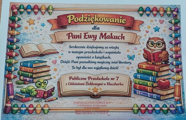 23 kwietnia obchodzimy Światowy Dzień Książki i Praw Autorskich – jest to święto autorów, wydawnictw, księgarń , ale przede wszystkim jest to dzień czytelników. I właśnie dzisiaj dzieci z Publicznego Przedszkola nr 7 w Kluczborku podczas wspólnego spotkania na dywanie poznały „magię książki”. Przedszkolaki wysłuchały „Bajeczkę o książeczce”, obejrzały niezwykłe w swej formie książki, wzięły udział w krótkiej zabawie paluszkowej i na zakończenie otrzymały „przyjaciółkę książki” – zakładkę, którą mogą pięknie pokolorować.