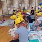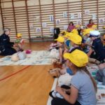 Po tym krótkim wstępie przeprowadzone zostały pierwsze zajęcia, na których Kierownik Filii Pedagogicznej Biblioteki Wojewódzkiej w Kluczborku – Ewa Dolata-Makuch zaprezentowała dzieciom opowiadanie pt. „Łukasz ratuje misia, czyli jak udzielać pierwszej pomocy” autorstwa Izabeli Michty. Po uważnym wysłuchaniu opowieści przedszkolaki uczestniczyły w warsztatach przeprowadzonych przez policjantów KPP w Kluczborku, podczas których ćwiczyły udzielanie pierwszej pomocy. Po zakończeniu warsztatów Burmistrz Wołczyna Pan Jan Leszek Wiącek wraz z policjantami wręczyli dzieciom pamiątkowe dyplomy i medale oraz plecaczki z logo akcji.