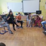 Druga część zajęć odbyła się przy udziale zaproszonych gości – uczniów klas III i VII oraz nauczycieli. Uczestnicy projektu wykonali „Piosenkę o szczęściu”, którą sami stworzyli. Prezentacja działań projektowych, przeczytanie napisanej przez dzieci śląskiej bajki oraz wspólne śpiewanie to główne elementy finalnego spotkania. Każdy z uczestników projektu otrzymał pamiątkową książeczkę-broszurkę na temat realizacji projektu ze zdjęciami z zajęć.