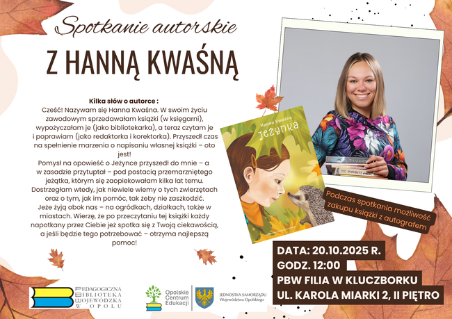 PBW Filia w Kluczborku serdecznie zaprasza dzieci w wieku przedszkolnym oraz wczesnoszkolnym na spotkanie autorskie z Panią Hanną Kwaśną- autorką książki pt. „Jeżynka”, które odbędzie się 20 października 2025 r. o godz. 12:00.