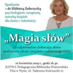 Serdecznie zapraszamy na spotkanie z dr Elżbietą Zubrzycką – psychologiem, terapeutą, autorką książek dla dzieci, młodzieży i dorosłych, prezesem Gdańskiego Wydawnictwa Psychologicznego, które odbędzie się 10 kwietnia 2019 r. o godz. 16.30 w RZPWE Pedagogiczna Biblioteka Wojewódzka Filia w Nysie, przy ul. Tadeusza Kościuszki 10.