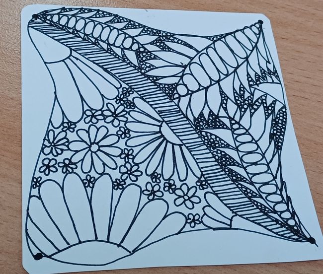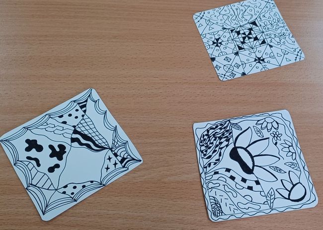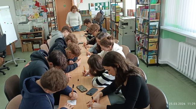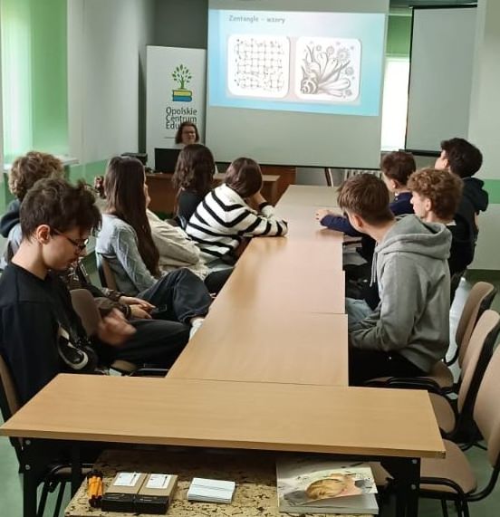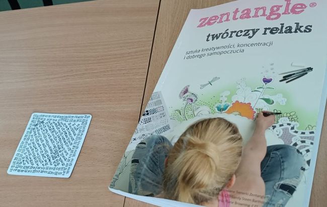 25 marca 2026 r. uczniowie kl. V TC z Zespołu Szkół Licealno-Technicznych w Kluczborku podczas warsztatów w Filii PBW w Kluczborku poznali technikę artystycznego odprężania się – Zentangle®., którą opatentowali amerykańcy lekarze: Rick Roberts i Maria Thomas. Młodzież podczas zajęć oddała się twórczemu relaksowi, stworzyła efektowne grafiki ćwicząc jednocześnie wyobraźnię i koncentrację.
